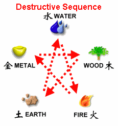 This is a result of an imbalance or a disturbance to the natural order. This is where: Water puts out Fire; Fire melts Metal; Metal breaks Wood; Wood (roots of plants) penetrates the Earth; and Earth is absorbed Water.