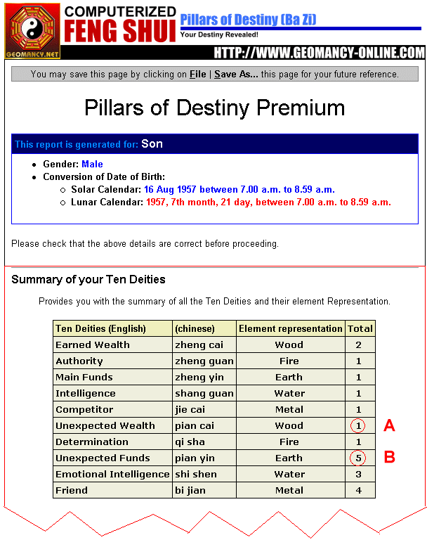 Yes, this also comes standard in all our on-site audits. You also get a bonus, your detailed individual family's full Ba Zi (Eight Characters) report will provide you with a glimpse as to whether you or your family members have (A) unexpected wealth (pian cai) and or(B) unexpected funds (pian yin) as shown below:-
